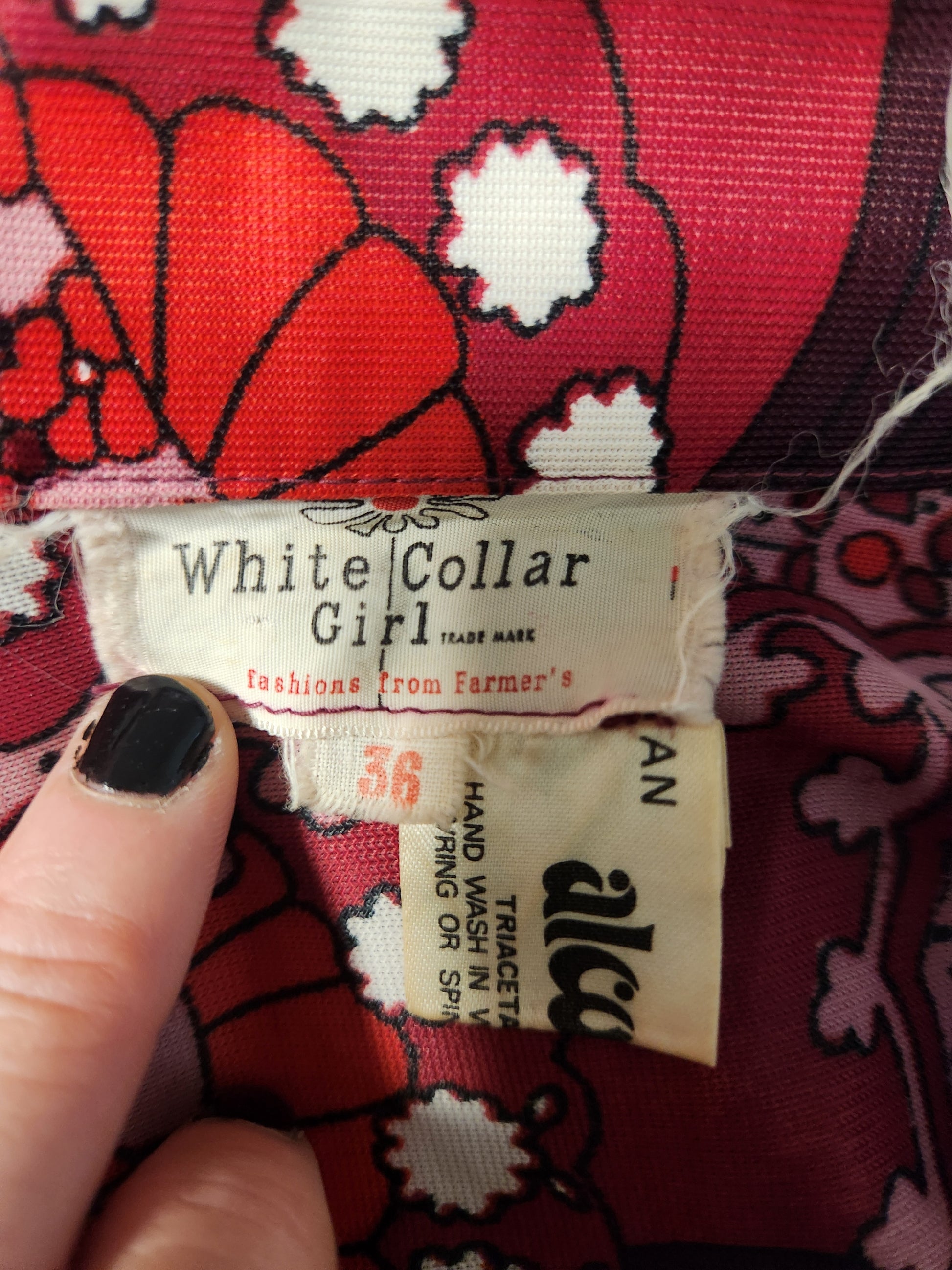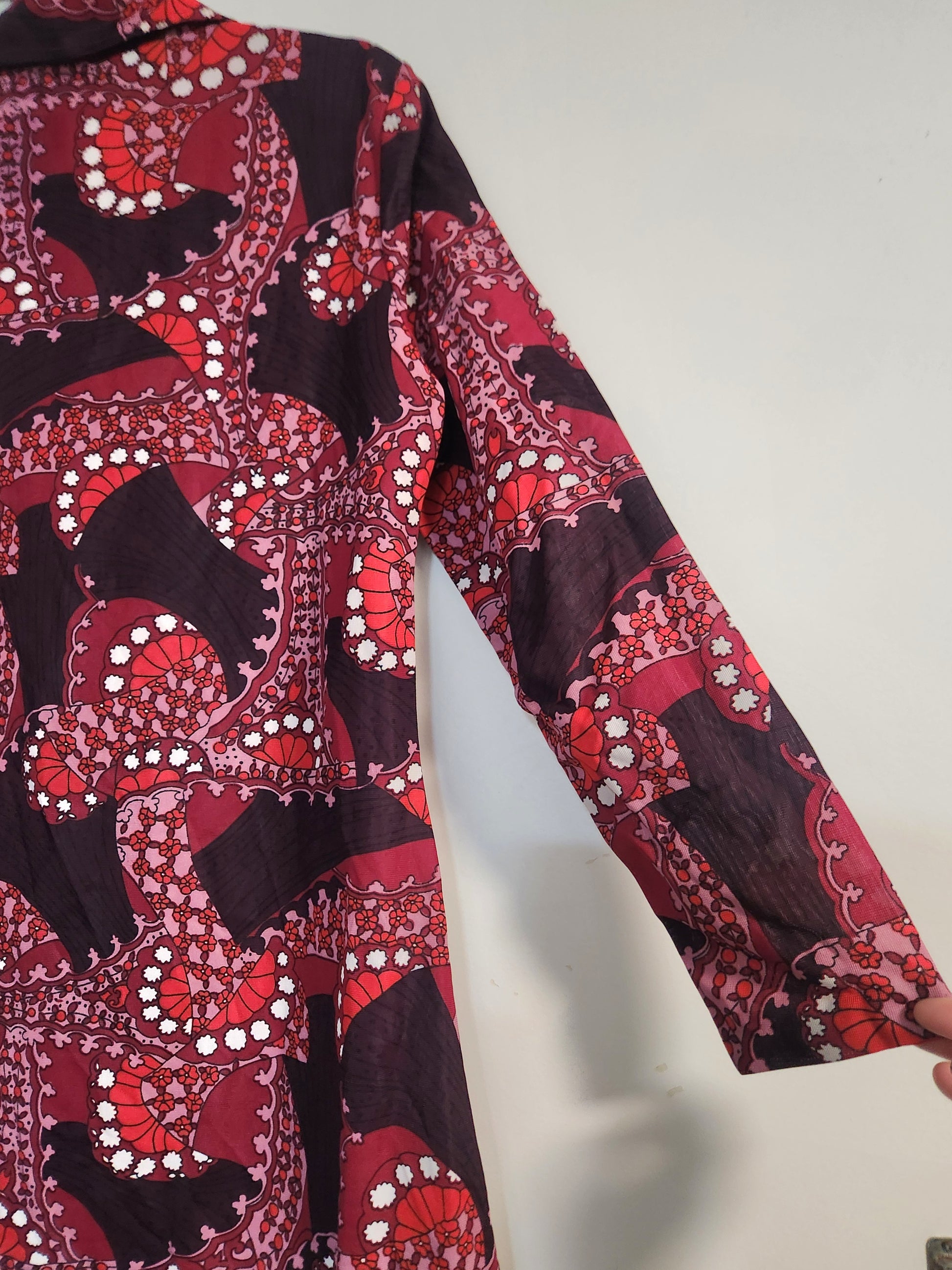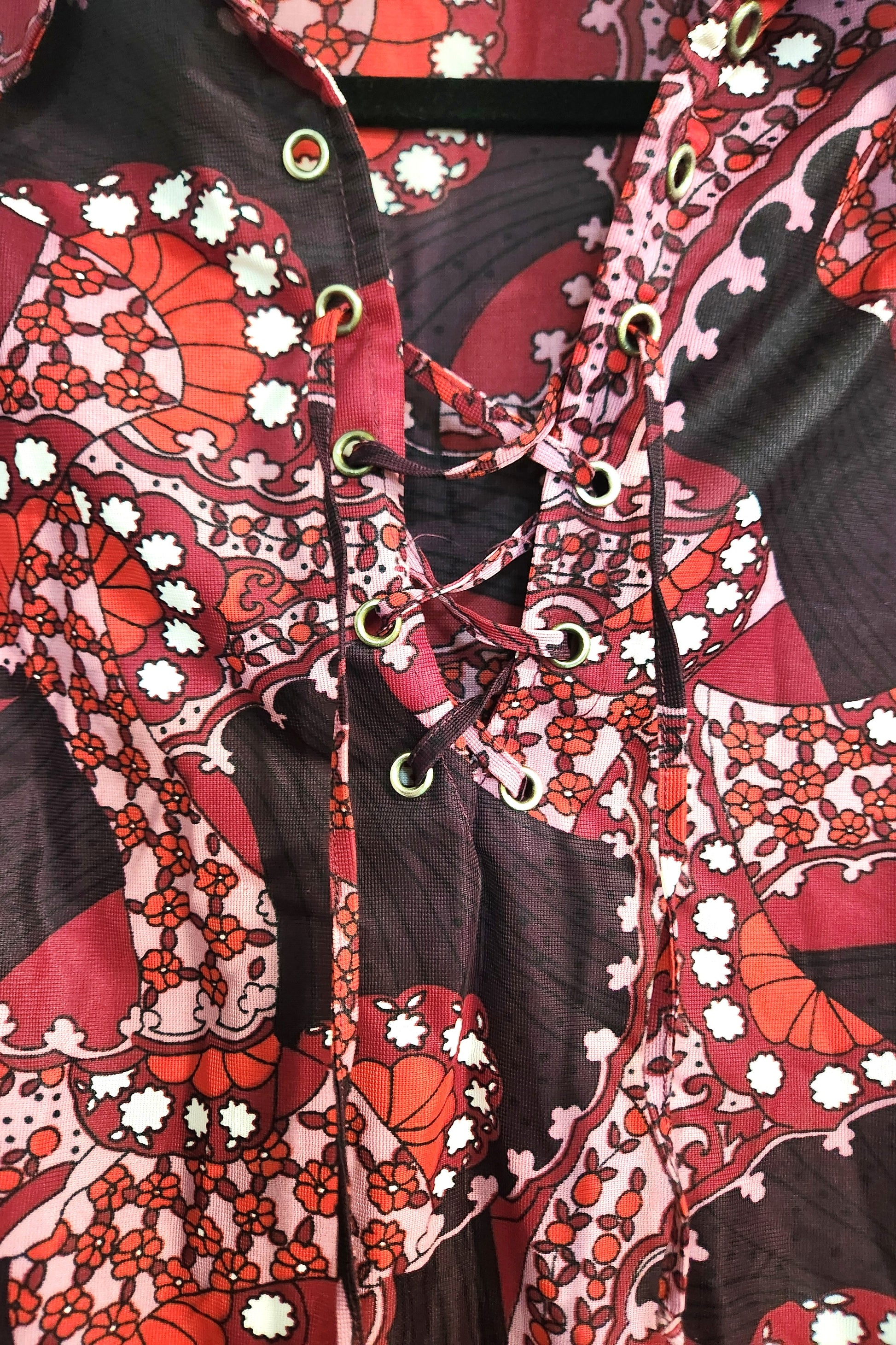 Polyester retro print dress. Pointed retro collar with lace up neckline. Cotton lace hemline and long sleeves.
